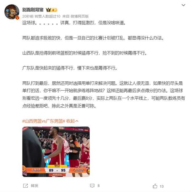 賽后大V別跑剛背豬寫道:這場(chǎng)球打得挺激烈但沒啥味道,兩隊(duì)打到最后都是靠單打解決問題,別看廣東一度領(lǐng)先10多20,可最后只贏6分,實(shí)際上兩隊(duì)在一個(gè)水平線上,兩隊(duì)教練員有點(diǎn)經(jīng)驗(yàn)差距,除此之外乏善可陳。