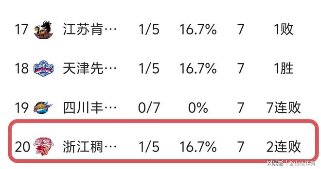 目前,排在積分榜后四位的,分別是江蘇隊(duì)1勝5負(fù),排積分榜倒數(shù)第四位;天津隊(duì)以1勝5負(fù),排積分榜倒數(shù)第三位;四川隊(duì)以0勝7負(fù),排積分榜倒數(shù)第二位;浙江隊(duì)以1勝6負(fù),排積分榜倒數(shù)第一位。浙江隊(duì)開賽至今,僅僅擊敗福建隊(duì),先后不敵遼寧、廣東、寧波(雙殺)、北京、上海隊(duì),與球隊(duì)賽季前的預(yù)期目標(biāo)相去甚遠(yuǎn)。